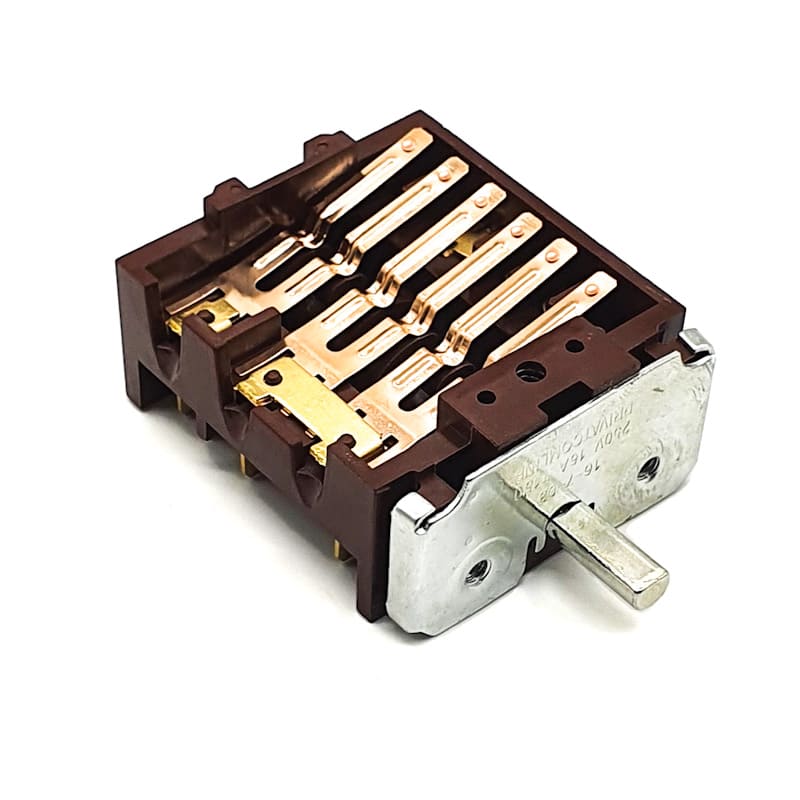 Пакетный 7-ми (6+0) позиционный переключатель предназначен для переключения мощности нагревательных элементов чугунной конфорки в плитах типа Мечта. 7 позиций переключения - 6 рабочих позиций и 1 нулевая, вал 16 мм.